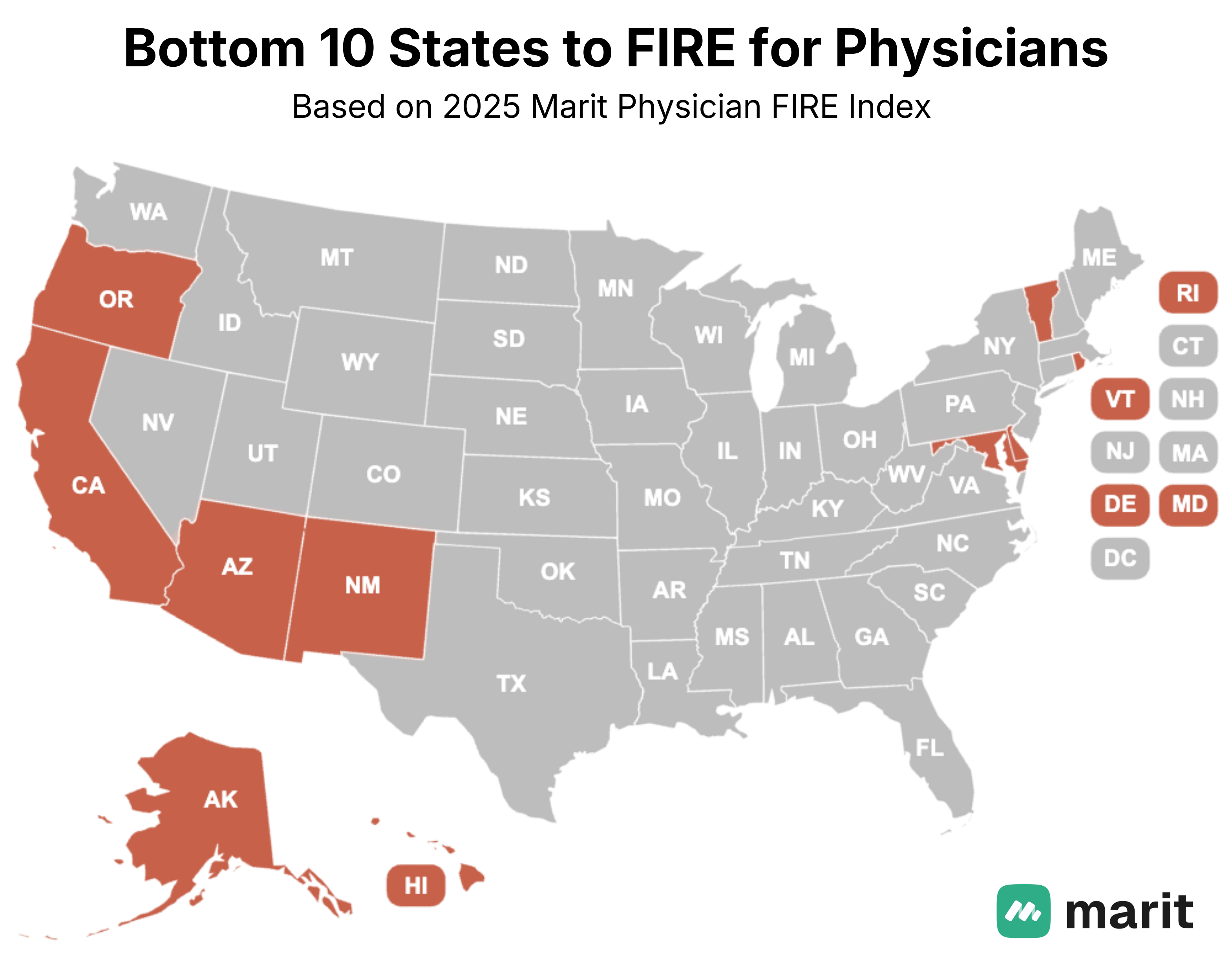 In our earlier post on the 2025 U.S. Ranking of Best (and Worst) States for Doctors to Retire Early, we ranked all 50 states using Marit’s Physician FIRE Index, which combines physician salary data with state-level data on cost of living, taxes, quality of life, and malpractice climate.